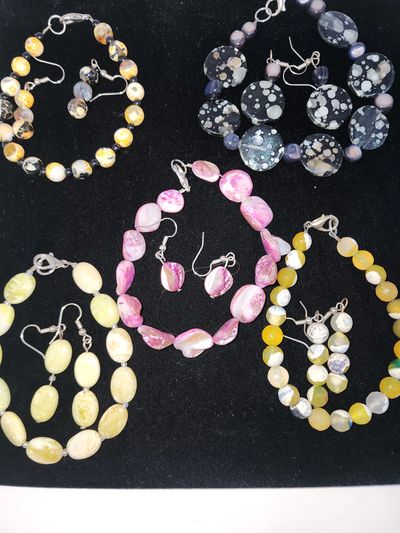 Claudia's bracelet/earring sets are made of genuine stones and or shells. The bracelet clasps and rings, as well as the earring hooks are high-quality Sterling Silver plated, contain NON NICKLE, and are hypoallergenic. She uses 7 strand wire wrapped in plastic on all of her necklaces and clasp bracelets She can create any set using .925 STERLING SILVER at an additional cost. Claudia's bracelets are typically between 8" - 9" inches. Please email, text, or call me with SPECIFIC SIZES AND MATERIALS PRIOR TO ORDERING.